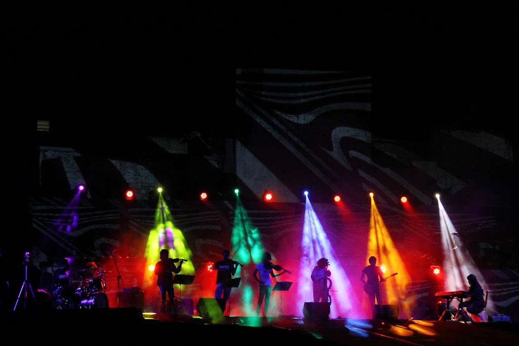 Yang ditunggu-tunggu manggung giliran kedua. Ketika Sekar Jindra selesai, saya menegakkan punggung dan berhenti mengetik suatu pesan di handphone. Delapan orang naik ke atas panggung, pemain bass, drum, tiga biola, satu cello, satu gitar, dan seorang pemain piano. Saat mereka membuka pertunjukan dengan Lalulalang dan Paripurna, tiba-tiba saya menyadari sedikit ketegangan yang aneh di deretan panitia di belakang saya. Baru saat lagu ketiga, Metropolis, saya paham. Ada Mas Gufi yang memberi komando pada tim lighting lewat HT. Ada video mapping yang sesuai dengan dinamika lagu. Ada permainan lighting spektakuler yang ikut melebur bersama lagu. Di bagian-bagian tertentu lagu, kedelapan personel disorot satu persatu dengan cahaya-cahaya yang berbeda, membuat mereka terlihat begitu wangun. Pada saat lagu hampir mencapai puncaknya, Mas Gufi mulai berteriak-teriak ke HT "Yo, saiki yo, SAIKI YO!" sehingga saya ikutan tegang mengawasi terjadinya klimaks musik dan cahaya. Dengan bantuan panitia yang sadar skena, lagu tersebut dibawakan dengan sangat megah. Sekitar sepuluh menit yang nyaris divine dengan perpaduan musik favorit yang telah lama ditunggu penampilan langsungnya, permainan cahaya yang sangat baik, penonton yang antusias, sungai, angin lembah, lalu lintas, kereta api yang lewat....